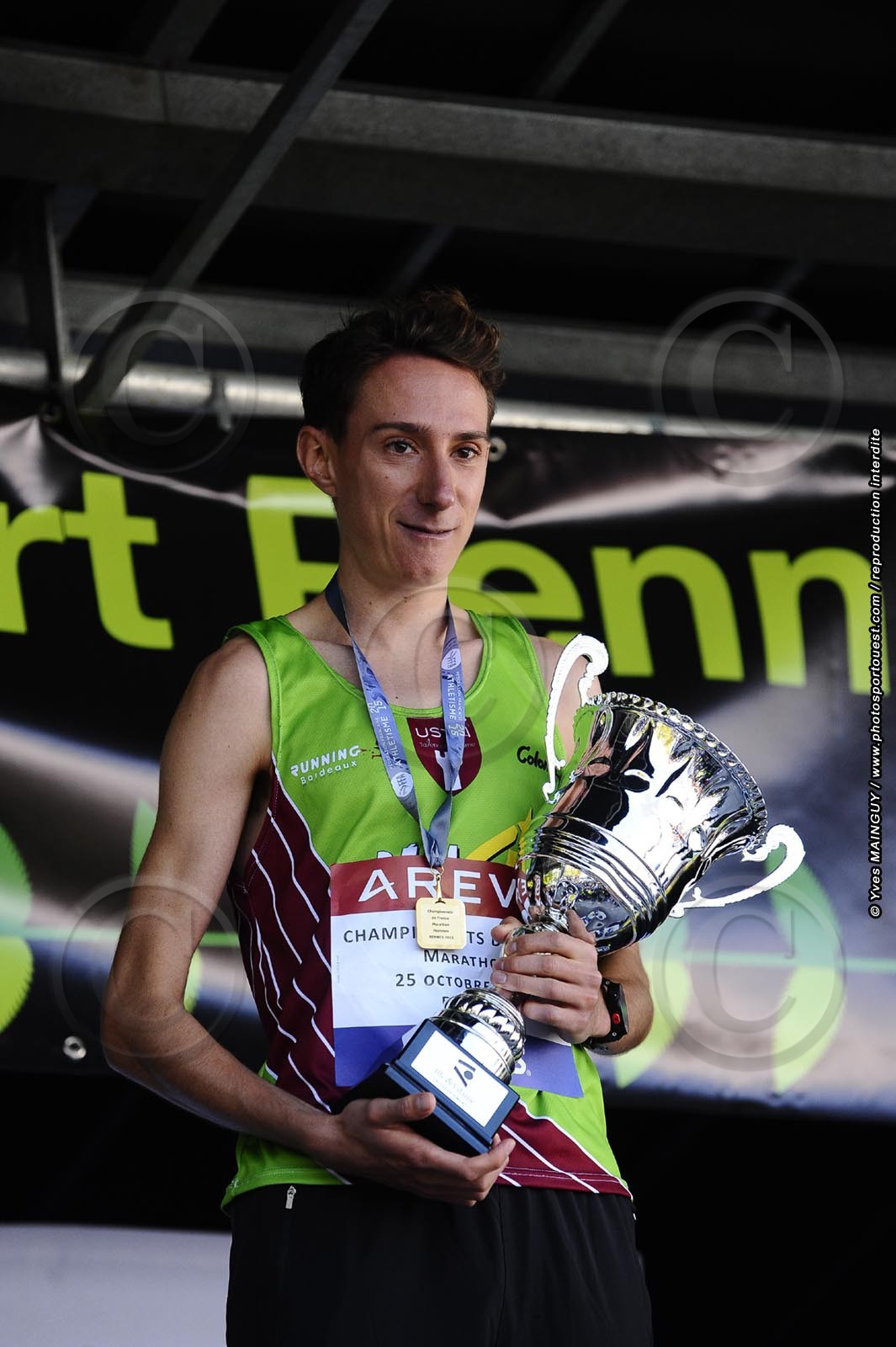 Podium G/D: Guislain SCHMIED (2°), MickaëL GRAS (champion de France) et Sebastien CHARNAY (3°). Championnat de France de Marathon. MARATHON VERT 2015. Rennes (35), le dimanche 25 octobre 2015. Photo: © Yves MAINGUY