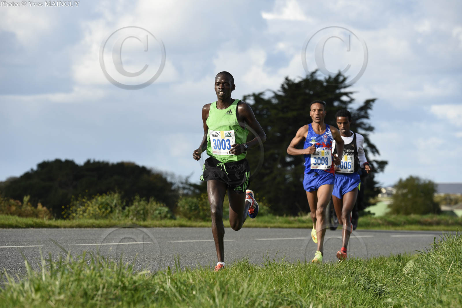 Kirkemol Limoth (vainqueur) devant Tura Kumbi Bechere (2�) et Duncan Kipkurgat (3�). SAINT POL - MORLAIX 2016, semi-marathon, 44� edition. Morlaix (29), dimanche 06 octobre 2016. Photo: � Yves MAINGUY